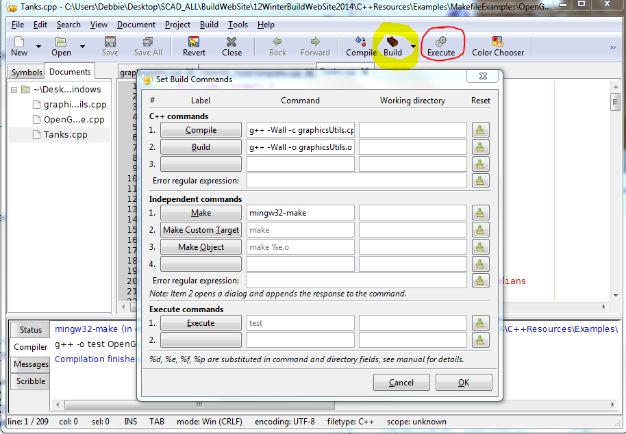 1. Start up Geany2. If you are working on a single cpp file, you may simply add the needed flags to the build and command lines. However, if you are using multiple sources you will want to create a makefile.