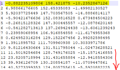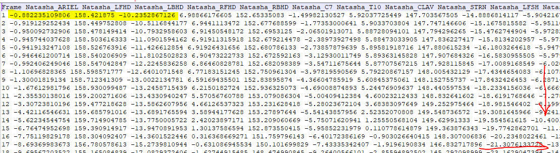 The sample data accessible above has a header listing the Frame number and marker label (point data) for all markers on the body (in our case 53, but you do not need to rely on this number). Below is a partial screen snap of the data supplied.
