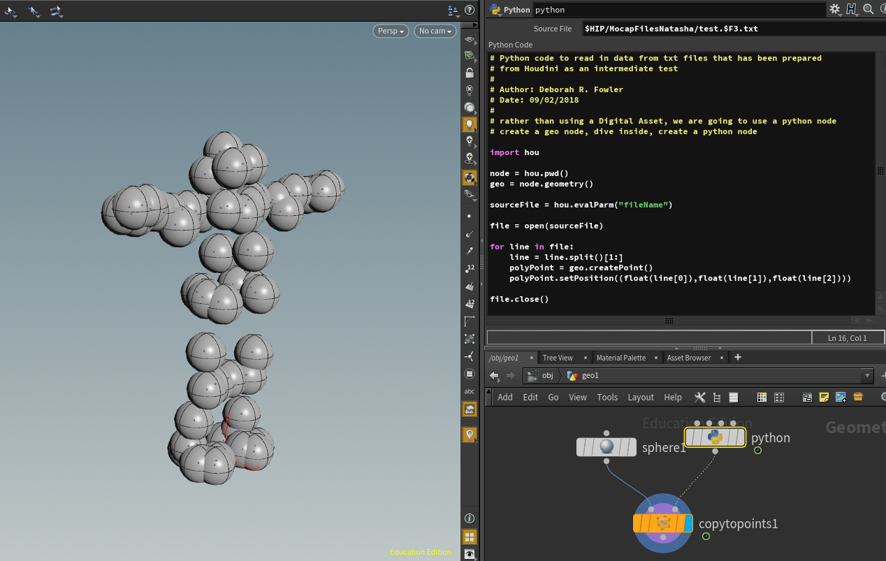 - An example of the python script that may be used inside Houdini to read in these files is given below in the screen snap. You must be able to clearly describe the code you create during presentation and comment it. The script to parse the single file into multiple files must be your own creation.