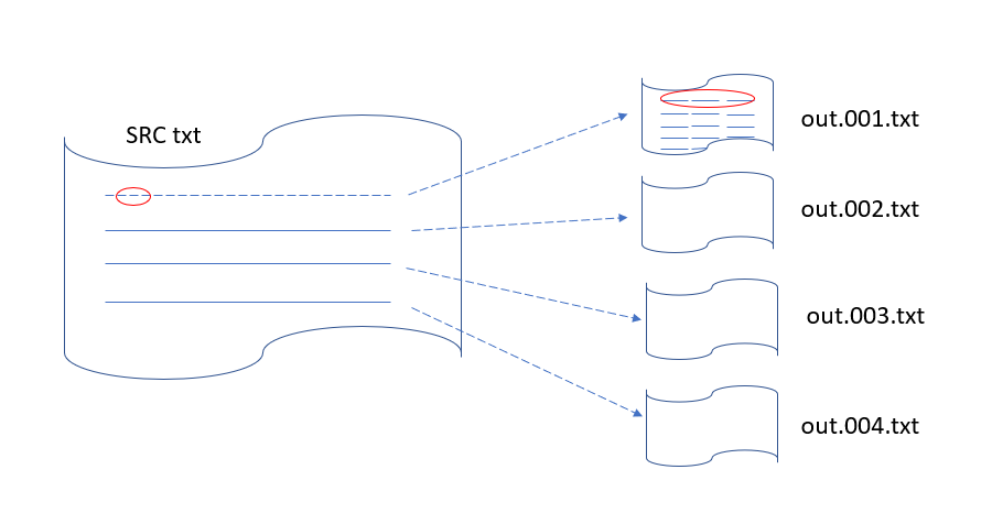 The script given below assumes your data looks as follows (adjust accordingly if you change it). NOTE the correspondence of the source file to ONE of the lines in out.001.txt highlighted in yellow.