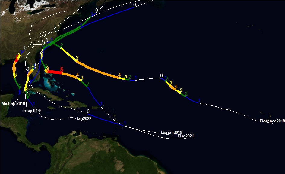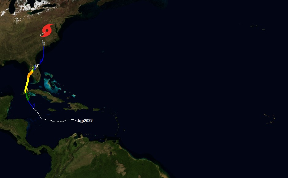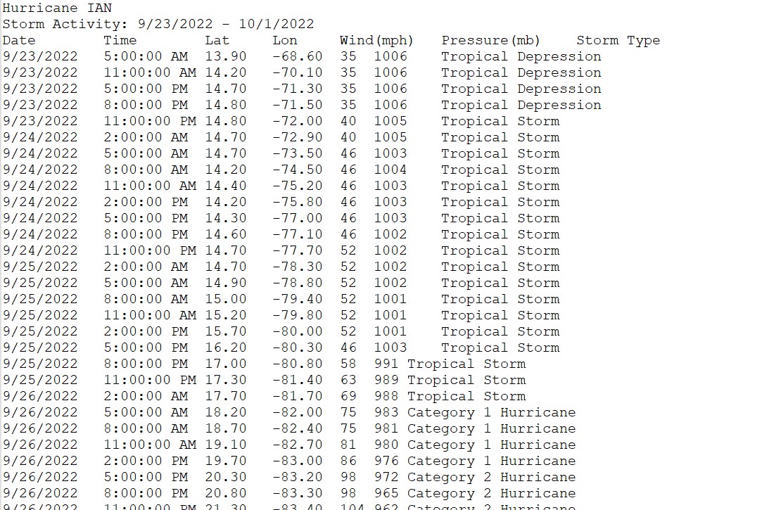 Using one of the files, say Ian2022.txt your hurricane function should show the hurricane path and include the following: