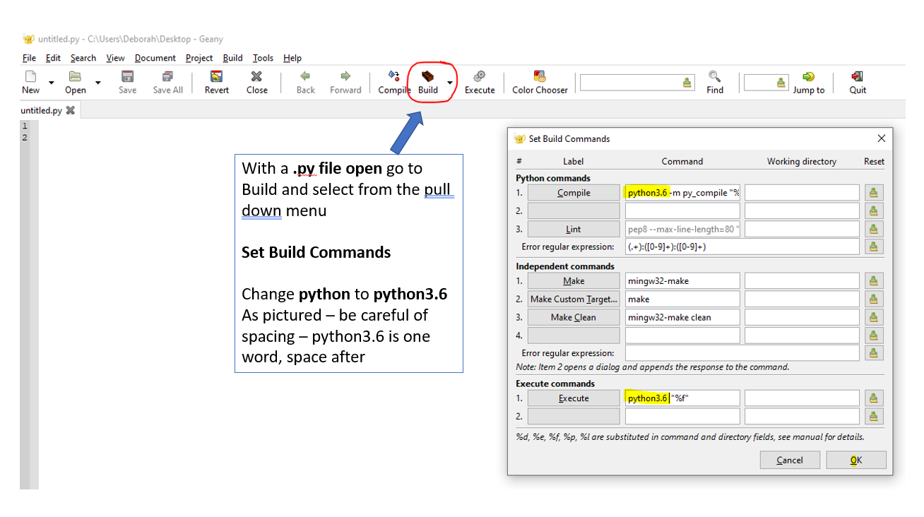 - VERSIONS Winter 2020 quarter - versions of python. Default version of python is set to 2.7 this quarter. To point geany to version 3.6 be sure to have a .py file open, then go to Build/Set Build Commands and set python to python3.6 as per the diagram below: