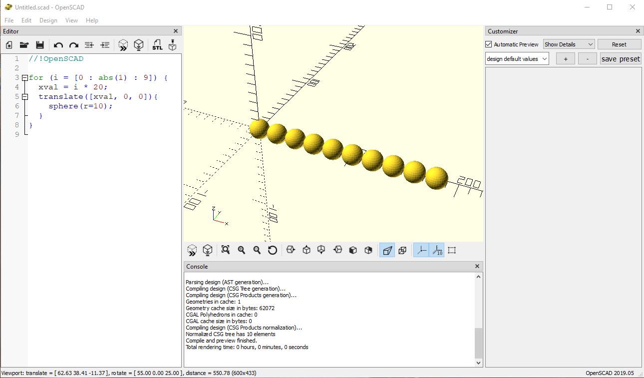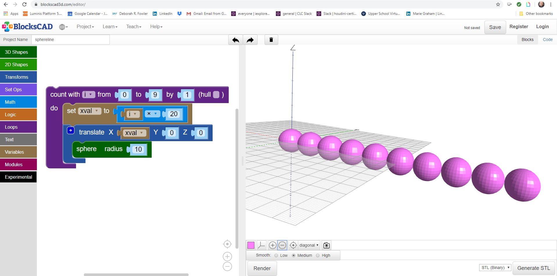 3D printing is becoming more and more affordable. I ran across a "scratch-like" program that produces models using simple code blocks called blocksCAD. Quickly creating an example similar to a Houdini introduction I created some simple code to show a line of spheres. File below is saved in sphereline.xml