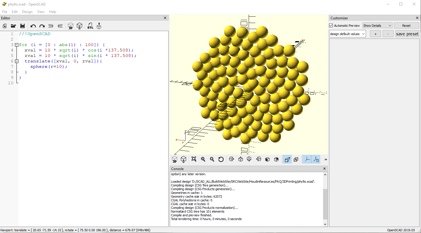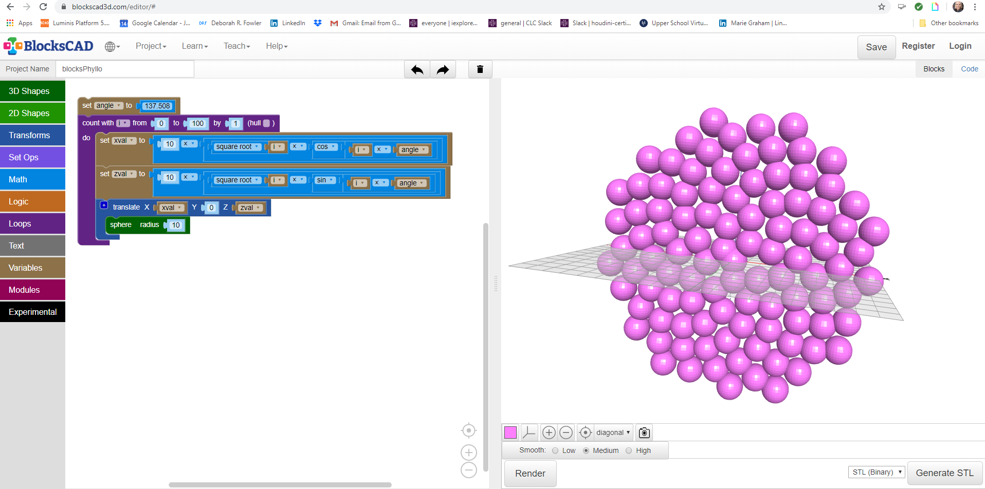 Phyllotactic Example written in OpenSCAD - phyllo.scad (need OpenSCAD installed on your machine to open this file). I also created it using blocksCAD code blocksPhyllo.xml