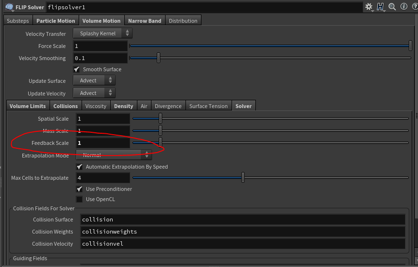 - flip solver - is a hybrid between a particle based and volume based fluid sim. Fluid data is stored in the particles however the pressure projection step is done on a volume that is created. A temporary velocity field is made. Particle velocities are transferred to a grid and the grid is used to perform the fluid projection.