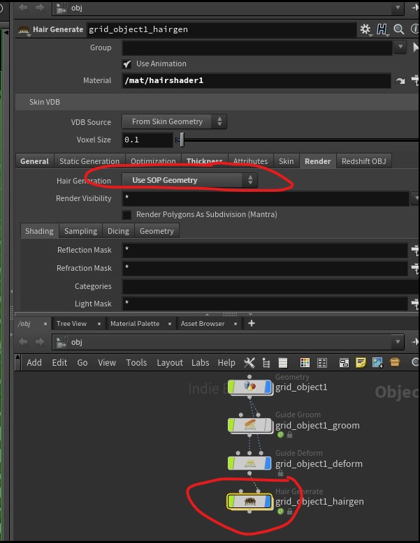 Note: In H19.0.383, I discovered that a simple shelf tool creation of fur on a grid did not render. An easy fix is to select in the hairGen node Use SOP Geometry. This is only necessary for some configurations according to the forums and was not necessary in H18.5.532 and earlier. I then added a guide process node to bend the grass (fur) in the guides and hairgen to match that setting was not necessary. Here is an example file with a process node guideProcessNode.hiplc