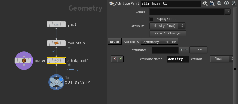 Attribute paint has been used to create density. In the Attributes tab change name to density. LMB paints fg color, MMB paints bg color. Note network below