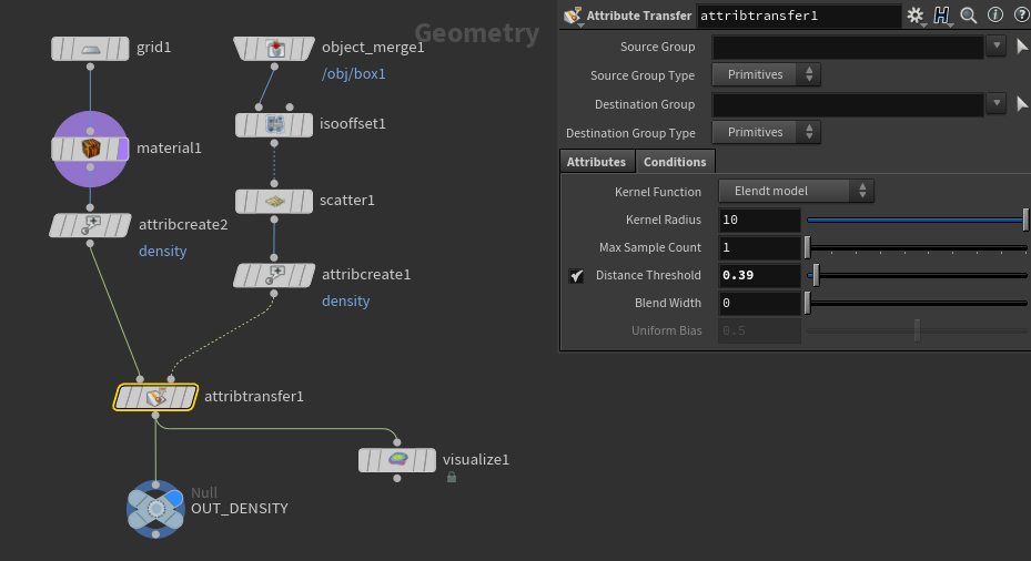 The value in the attribute transfer node can be changed to create a smaller area that is value density 0. Below is with attribute transfer Distance Threshold set to .1 above .39