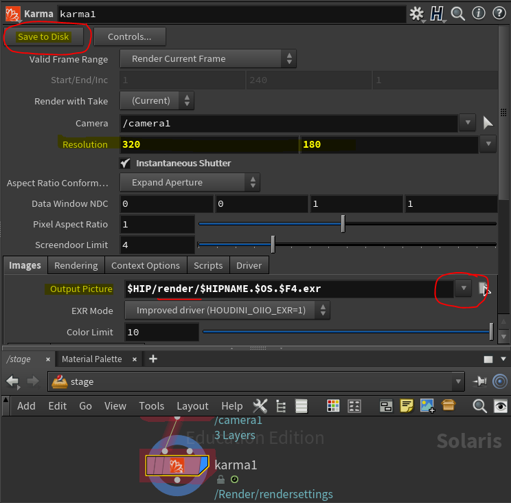 For an actual render - note the karma lop (node). Specify where you want to save the image and then click Save to Disk. This will create your rendered image (a process husk.exe is run)