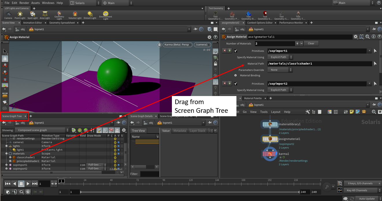 Option 2: Use the assignmaterial by dragging the mesh you want to assign to the primitive and dragging the material from the Scene Graph Tree.