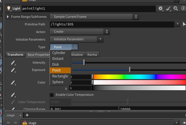 - Dome — environment light; usually use an HDRI in the texture parameter