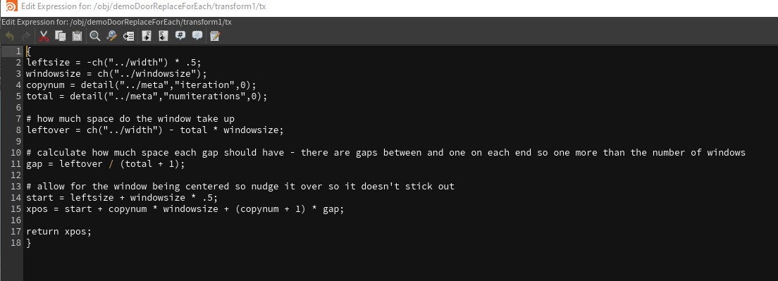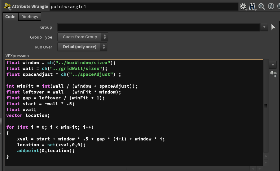 For example, my favorite way of distributing windows evenly spaced across a surface is to use a point wrangle node. The file below contains examples of using hscript, lines and points and point wrangles depending on your comfort level. I advocate the point wrangle but it is not necessary. Point wrangles only came into existence in H13 so prior to that this same technique was used with hscript. Click on the icon for the sample file.