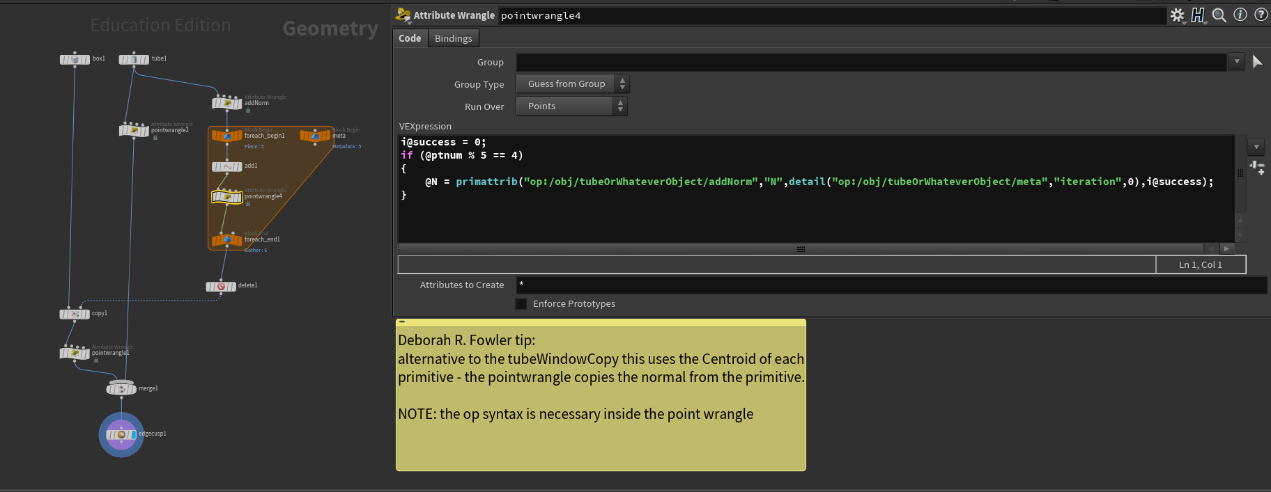 Note that it may be tempting to use $CEX, $CEY, $CEZ as an alternative to the shrink and fuse method — that will work for regular shapes, but not for something such as a platonic solid. The method above is more general. The alternative method does introduce the idea of for-each loops and uses the "op:" syntax in the wrangle nodes. This touches a bit more about wrangles. Click here for details.