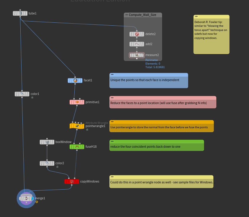Variations on this theme exist in the example file. This works great if your surface is flat, but what about rounded? or Turrets? There are several approaches. One of my favorites was inspired from a "Blowing Apart a Torus" tutorial — what does that have to do with windows you might ask? The facet node. Let's take a look: