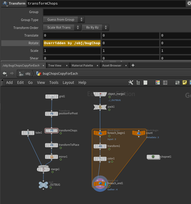 Click on the image of the fluttering grid bugs below for the hip file. Note that the orange indicates the parameter is being overridden by a chop.