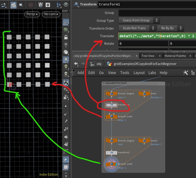 foreach loop - this node is a bit more obvious - it loops like a loop (although a bit weird with the counter in the foreach_end1 node, however the concept is familar in that when we use a "meta" node we can access the counter (iterator) and use it to place the object.