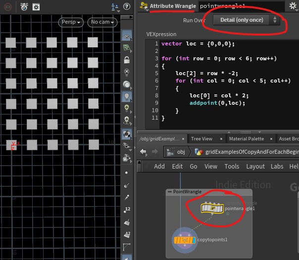 pointwrangle - wrangle nodes, also called attribute wrangles, can create the point positions in much the same way, and then we use a copy to points. This looks similar to your coding class, particularly if you are coming from processing/java/C#/C++ or any C-like programming language. This language is called vex. To be exact, it is a vex snippet. (I can talk more about the history of both these languages another time). This is what I can an explicit loop. It is obvious from the syntax that there is a loop structure, indeed a nested loop. Note: To create points, the point wrangle must be set to Detail(only once) which means it executes the code once.