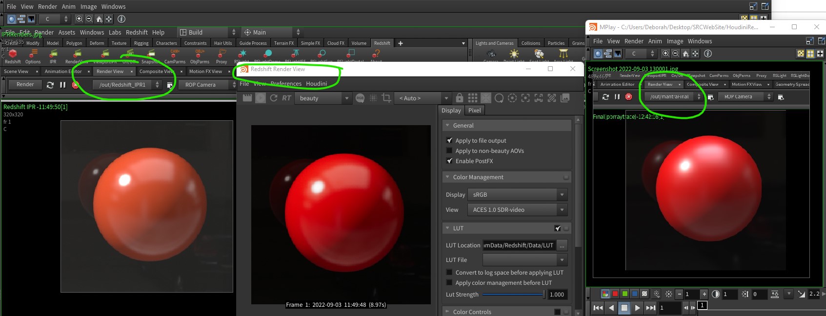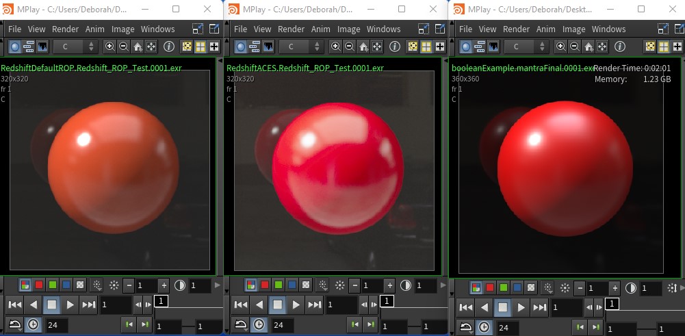 Here is what is then displayed in mplay - the non-ACES settings (left) and mantra (right) appear correct, the middle one is the Redshift Renderview resulting render to disk displayed in mplay.