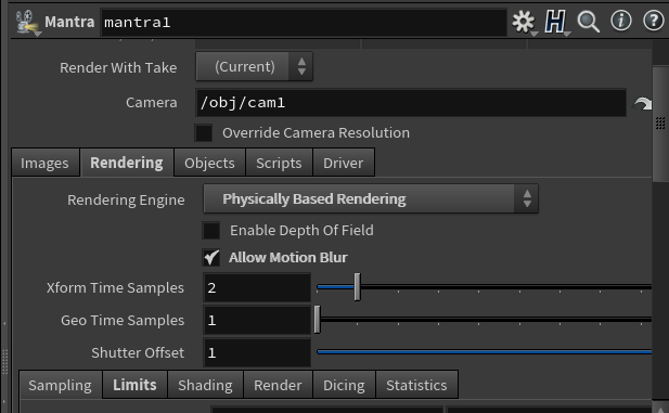 - Motion blur settings come into play in particular with compositing elements of Maya and Houdini - be sure to match using forward, backward or mid motion blur frames (Shutter Offset parameter on mantra node).