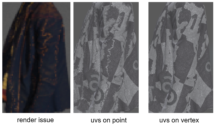 - One that sent me on a google search. My model in render appeared cracked after the boolean. Geometry was okay (despite the boolean warnings about cross-boundaries). However the uv's were being corrupted after boolean (seem below with the gold striping patterns on the jacket). After trying attribute transfer and various other methods, I almost switched to a clip node but one last forum search revealed a very simple problem and easy solution - the model had point uvs rather than vertex uvs - attribute promote to the rescue! Phew.