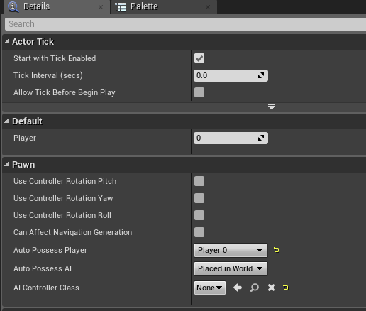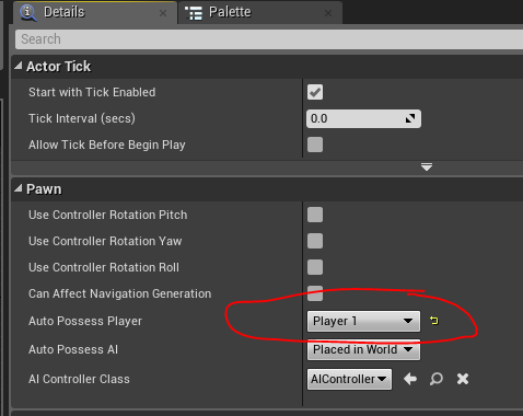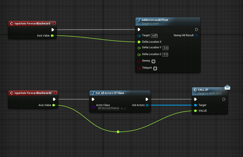 - Setup the input in your Settings / Project Settings / Input (Axis Mappings), Create two Pawn Blueprints, Create a Game Mode Blueprint, Create a Blueprint Interact (from the Content Add New green button). The blueprints are shown below. Be sure to set the "Auto Possess Player" in each pawn. Also, in Class settings of Pawn 2 Add the Blueprint Interact function to the class.