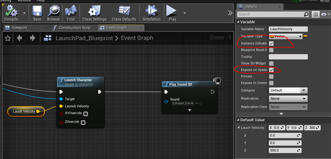 - construction script for set up of levels to expose values (runs at start, also when editting), event graph for run