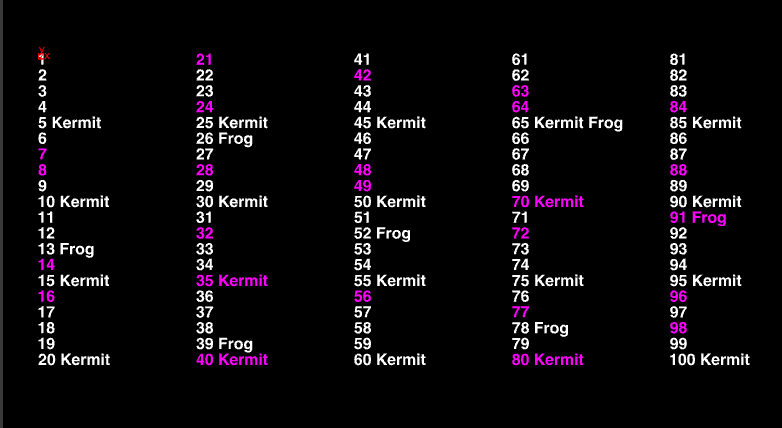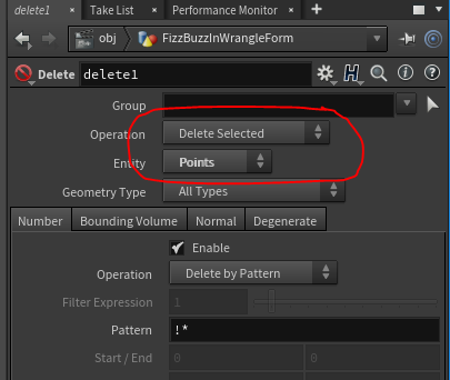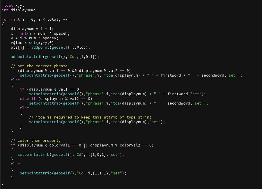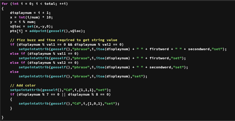 A popular programming example is Fizz Buzz. Since I assign this in two of my courses — one using hscript and the other C++ — I will not show those solutions, however I thought it would be fun to replicate it using a point wrangle node. The hscript version can be completed in 3 nodes; here I have a few other nodes.