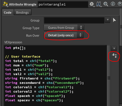 The icon that looks like a slider creates parameters on the node for user input. You can use the various types by specifying chi for integer, chf for float, chramp for ramp, etc.