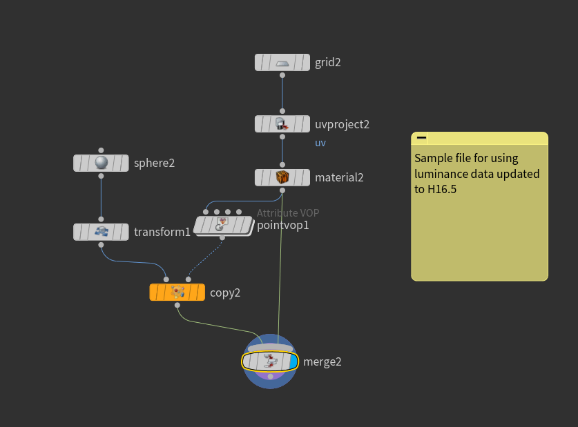 Here we apply an image to a grid, assign uv's and use the luminance value at the given vertext to control the size of a sphere (this was an older example, I believe from SideFX, but I have updated to use point vop and wrangle nodes below).