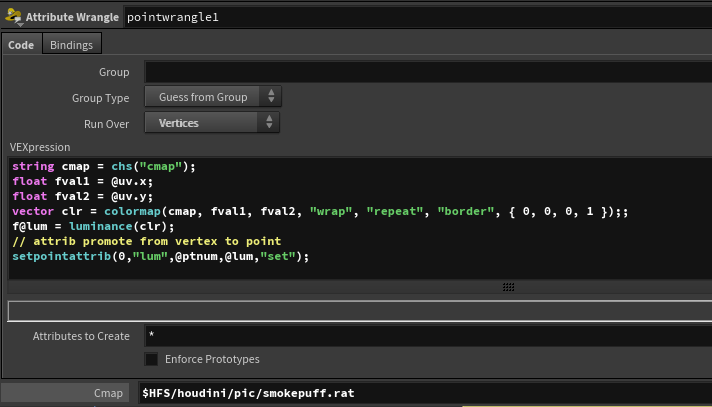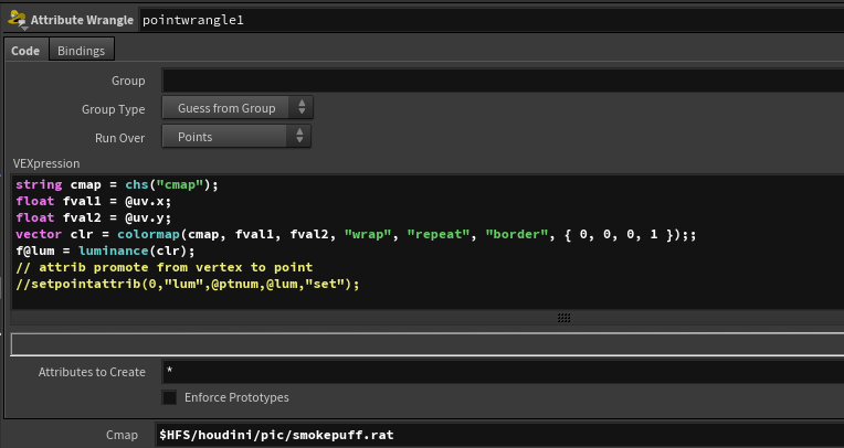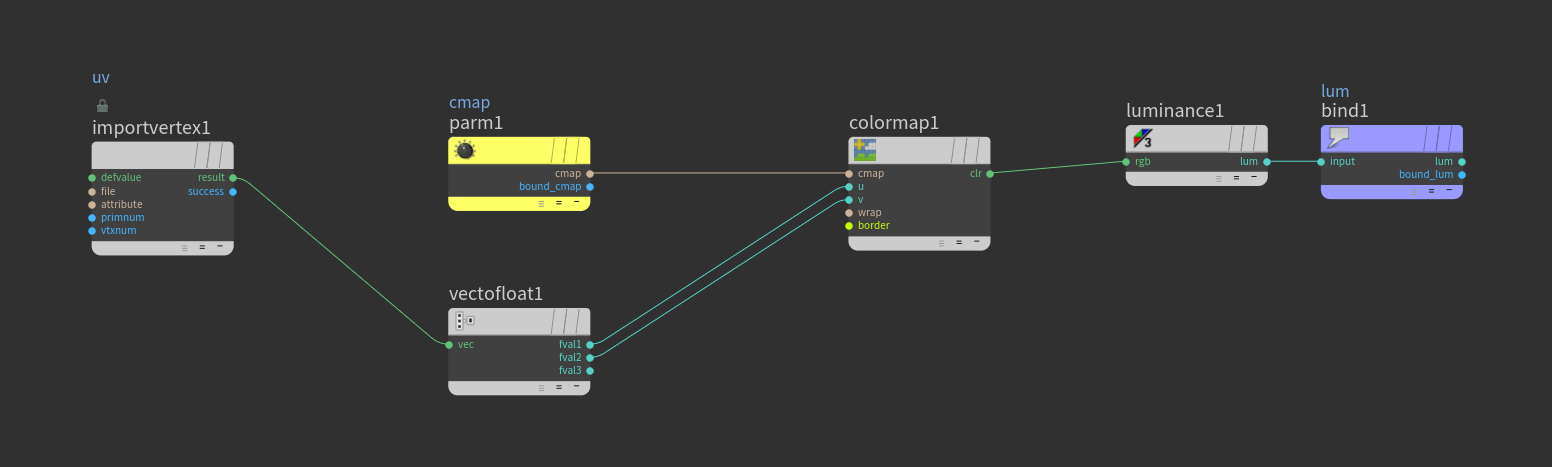Here we import the uv information, use the colormap parameter and feed that into the colormap node, exporint the luminance information with a bind node.