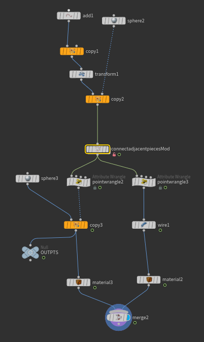 The point wrangle was adjusted in the connect adjacent pieces to add an attribute to keep track of the number of connections per point. This was used as a factor of brightness of the instanced lights.