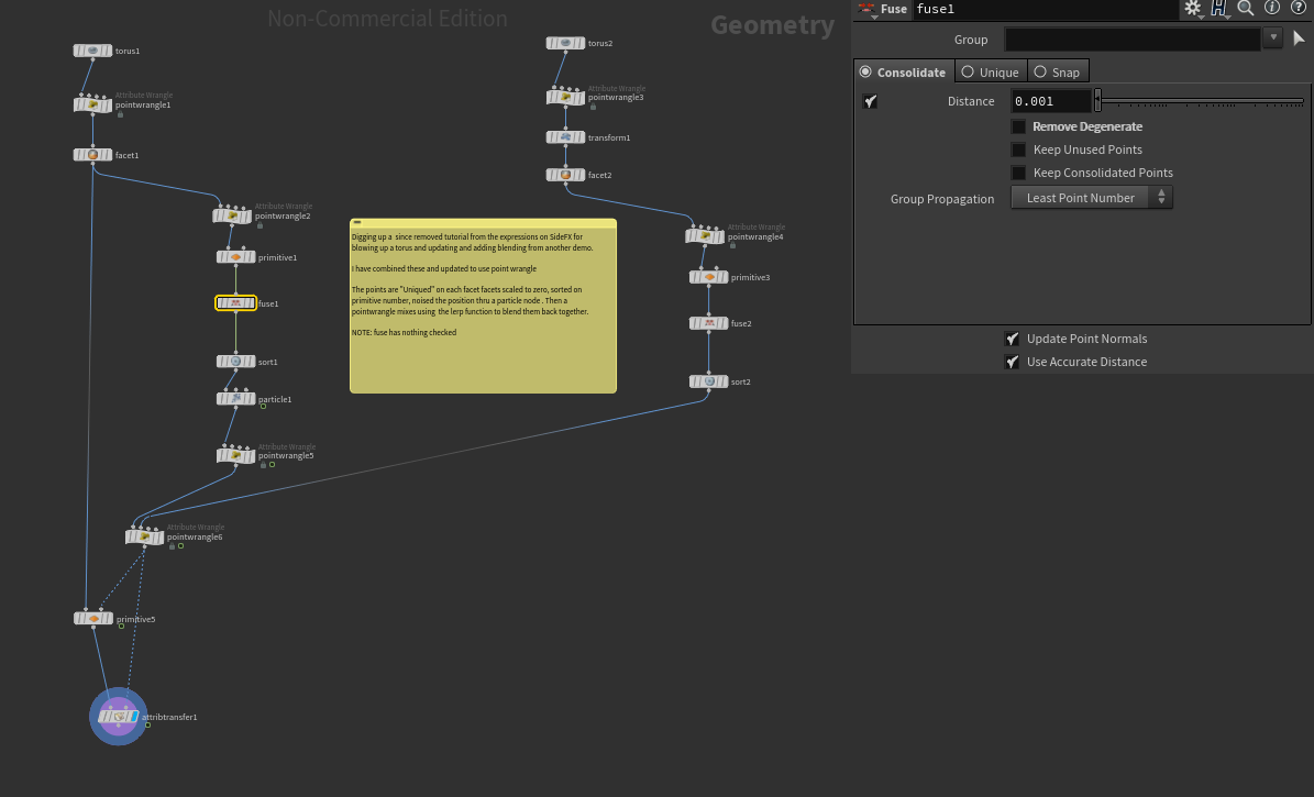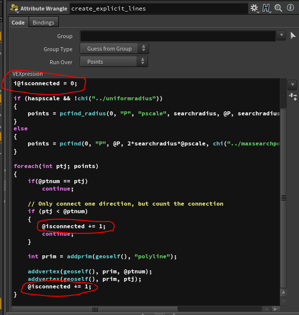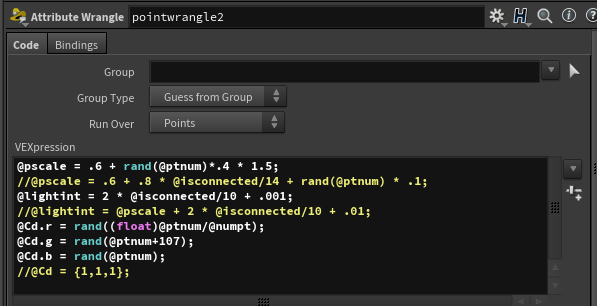 In this case the point wrangle values were changed - the size of the spheres as well as the light intensity are affected by the number of connections.
