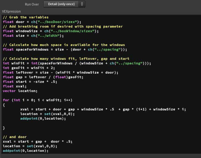 Here I am going to describe the last solution in the hipnc. There are many ways to position windows and doors and other example files are on my website but if you love wrangle nodes (or even if you don't) this is a great way to have a door and windows equally spaced on your building.