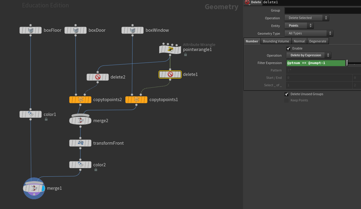 This example uses a wrangle node to calculate the number of windows in a given space with an evenly spaced gap. It is similar to the python exercise in 160 but now with a point wrangle node to do the calculation. Tags: delete node, copy to points, point wrangle in detail mode