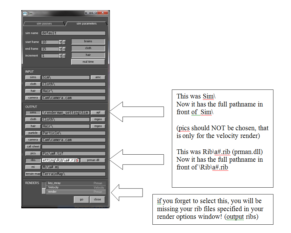 So to recap: 1. Create a Rib and Sim folder 2. Under menu Run-Sim-Sim parameters tab- push in "sim" and rib and specify full path name of folder (leaving the # to indicate the frame number)