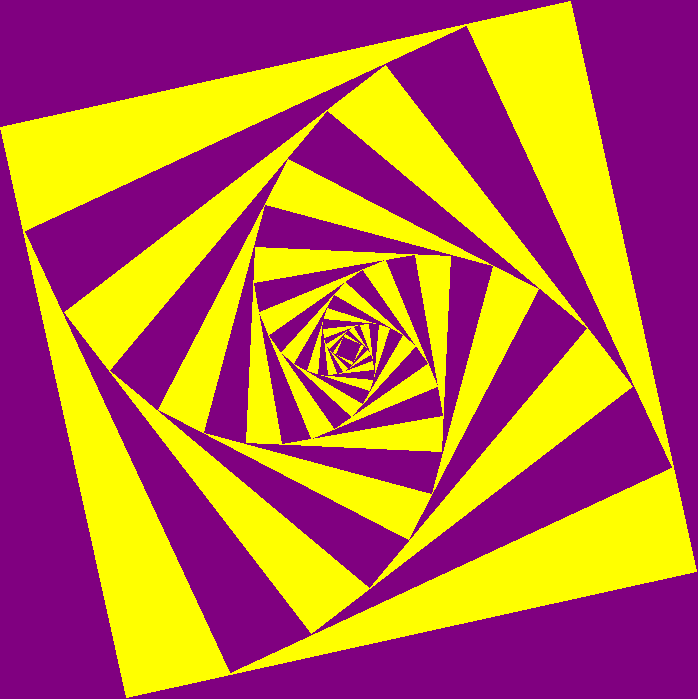 What is you were to use Python and Turtle Graphics? The same approach can be used. It is imperative that you use the shrinking rather than growing if you want filled squares as in turtle we are using a 2D tkinter window. Here are the same equations used in turtle graphics and python. The first one is 20 iterations, rotated 12.5 degrees and shrinking with pow(1/1.2,i). The second is 44 squares, rotation 6.05 degrees and scaling 1/1.1. The final one is with a smaller rotation, slower shrink rate and less rotation (70,1/1.05,3.125) and finally the same equation but iterating 20 times instead..