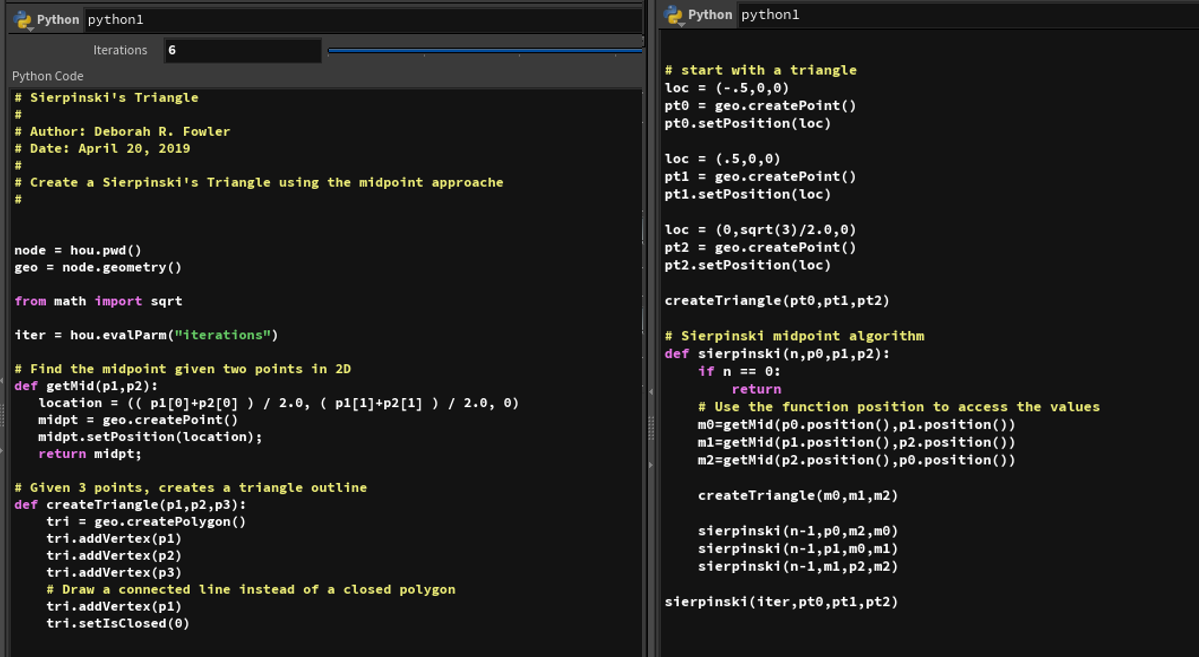 Sierpinski Triangle in a single point wrangle node in Houdini (link here). I have built