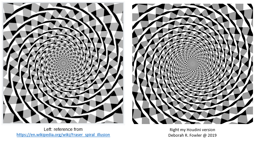 Another inspiration, again replicated using the same technique was found at https://creativemarket.com/Tartila/3852215-Optical-spiral-illusion.-Magic and can be found at https://www.123rf.com/photo_122571185_stock-vector-optical-spiral-illusion-magic-psychedelic-pattern-swirl-illusions-and-hypnotic-abstract-background-a.html I created the following in Houdini: