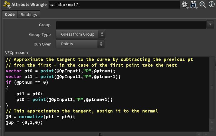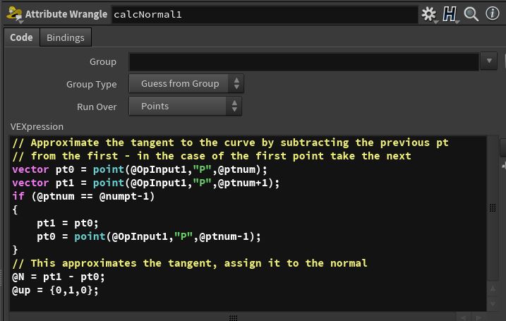 In addition, orientation vectors (tangentu, N, up) can be easily calculated by the code in either calcNormal1 or calcNormal2 — one uses the next point, the other the previous point (seen below). See the orient to a curve section on the tips and tricks page as well.