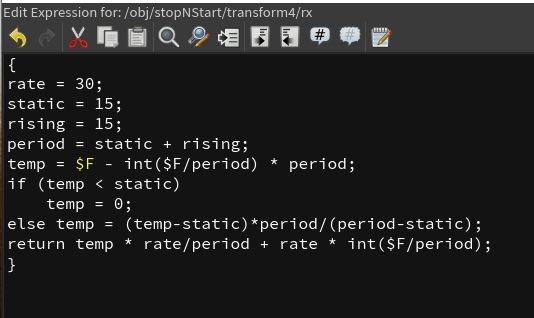 Suppose we call the frame range where it is horizontal static and the sloped part rising. It can be determined that this graph can be created using the following code — either a point wrangle or hscript as pictured below — to achieve the animation seen in the gif. The variable rate is how many degrees it spins during the sloped phase. In this example, 15 frames are static and 15 frames are rising. The reason both are set to 15 is because of the speed of the mechanism coming down with the cookie layers.