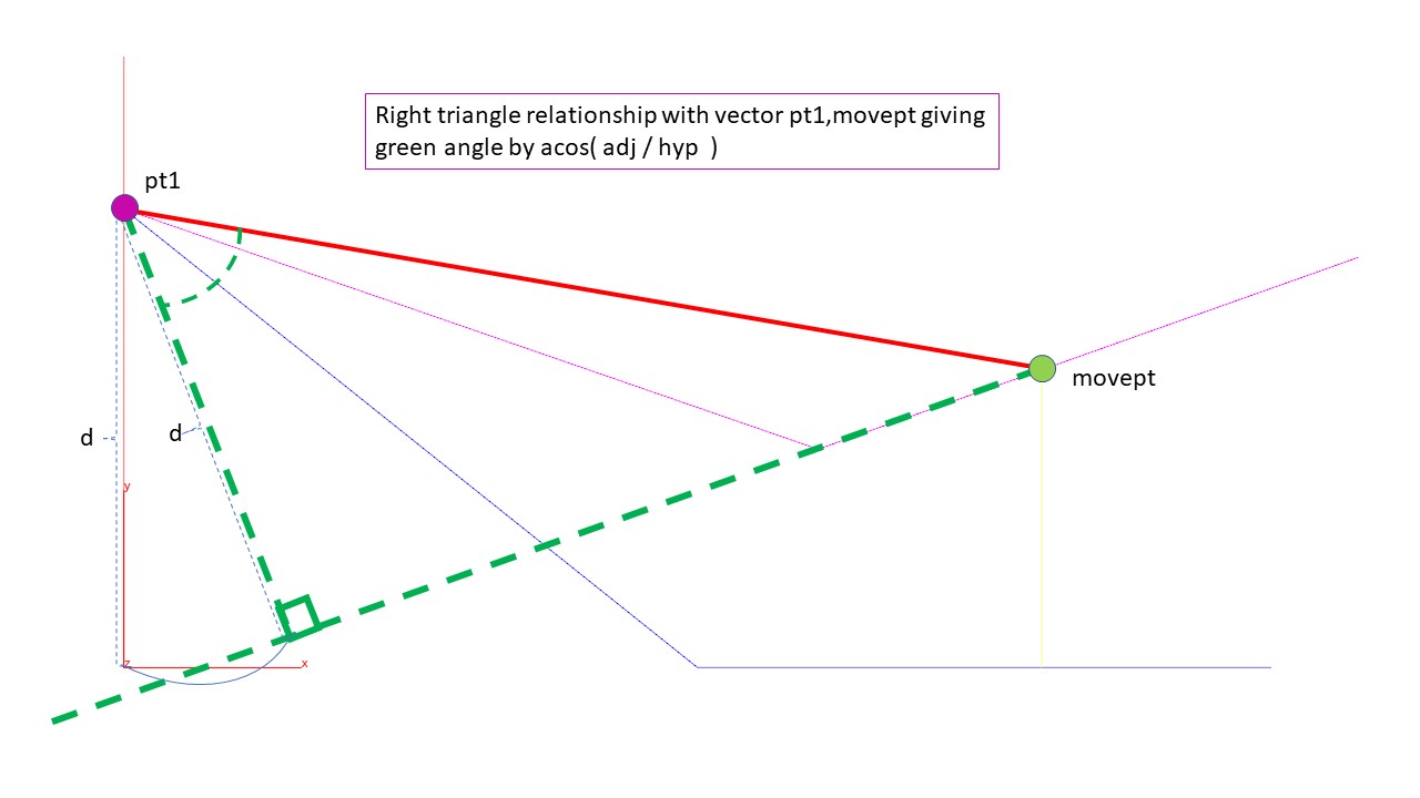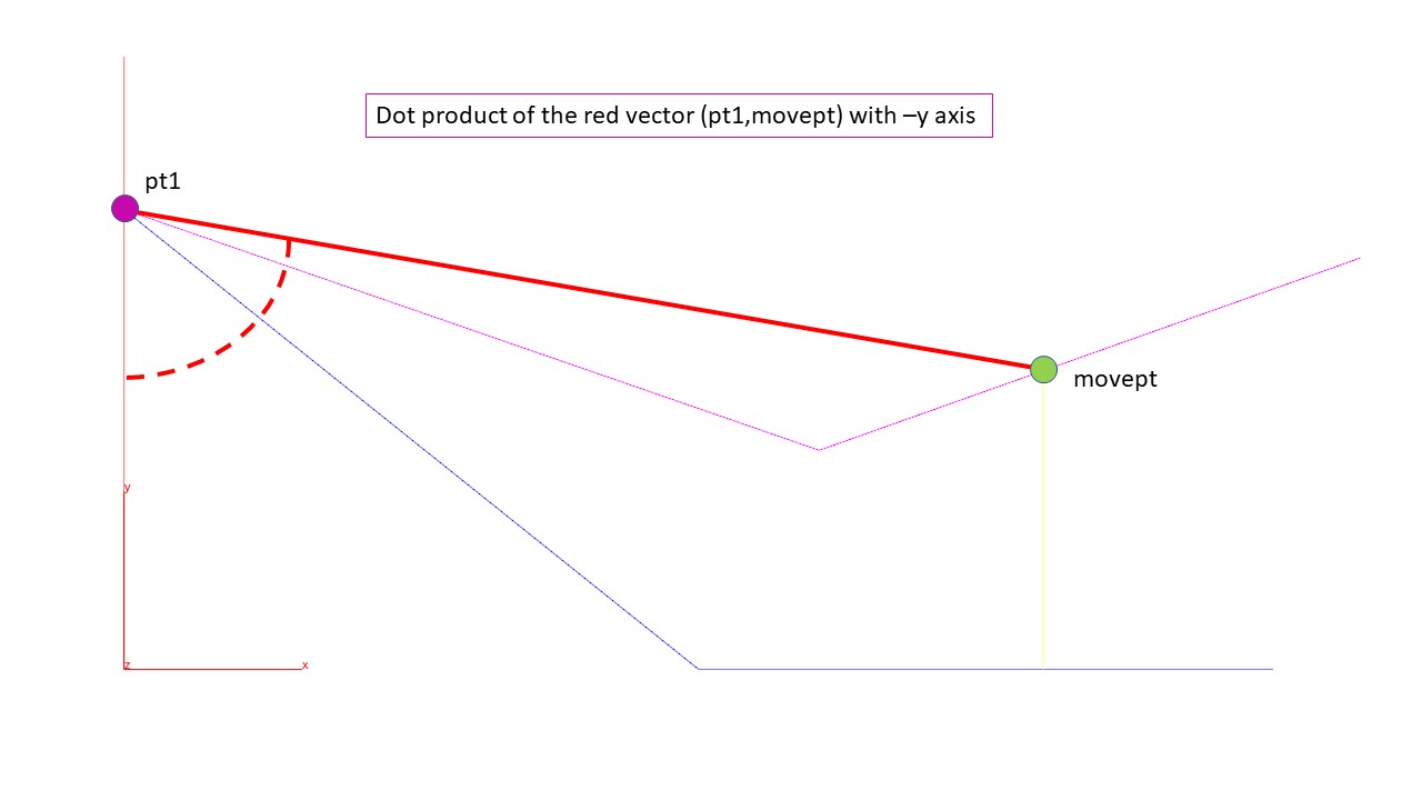 Analyzing the problem, we need to use both acos combined with a dot product. Here is the solution. You have a point (moving) labeled in green - movept in the wrangle above.