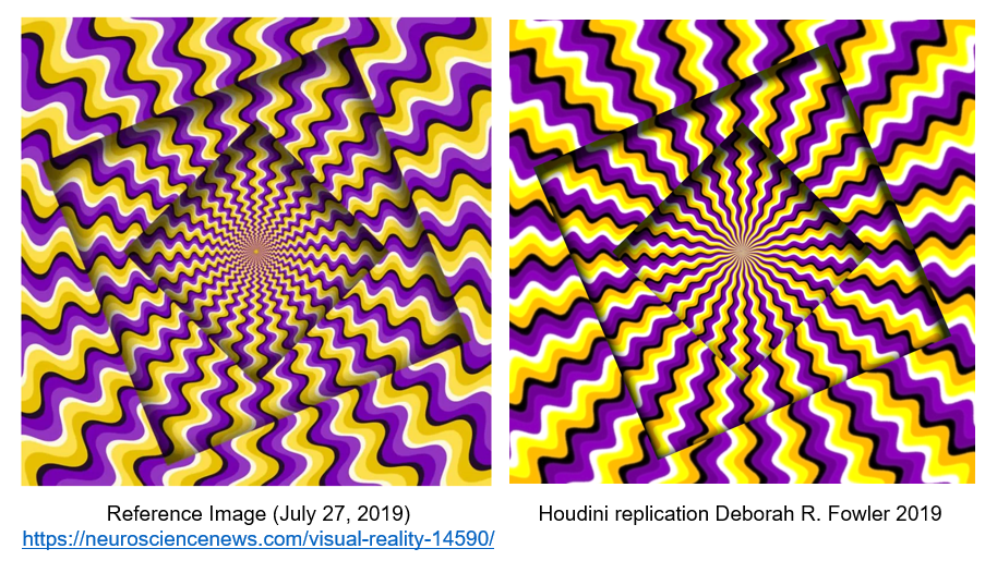 Continuing with Illusions, from https://neurosciencenews.com/visual-reality-14590/ The recreation of this illusion was reproduced in Houdini with both geometry and shader work.