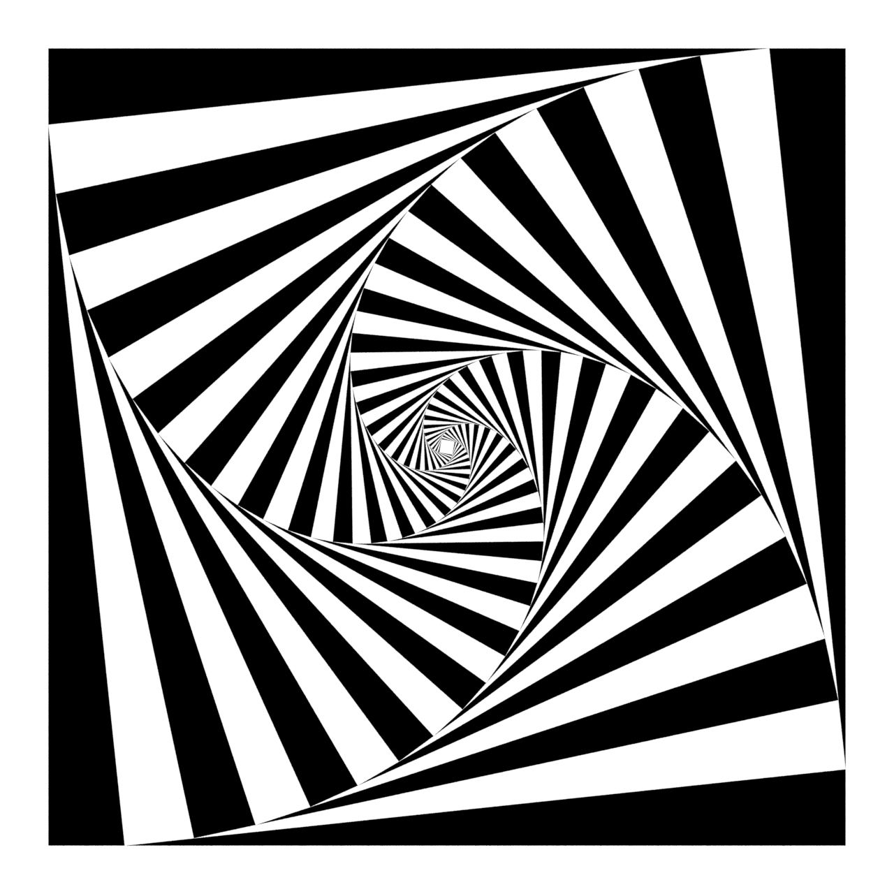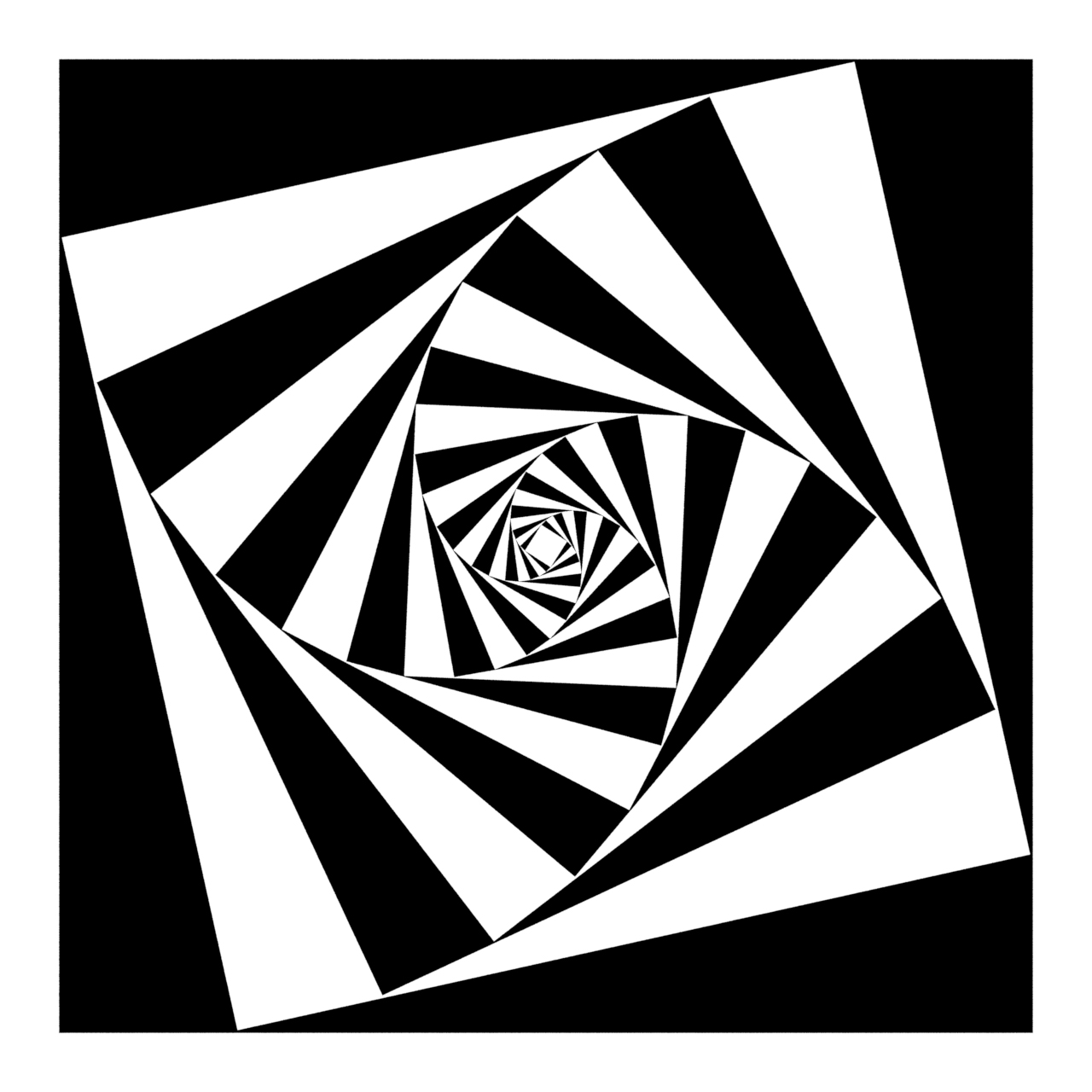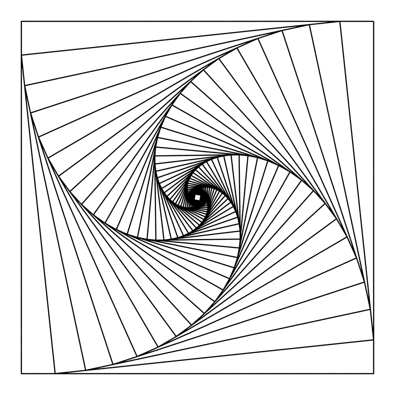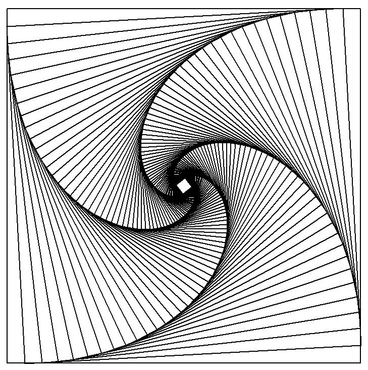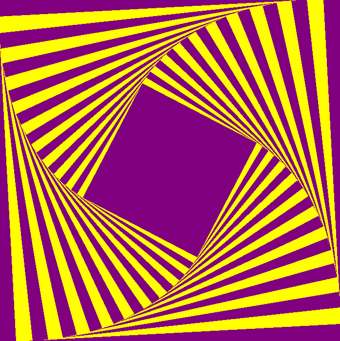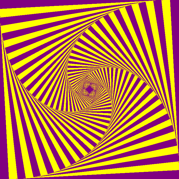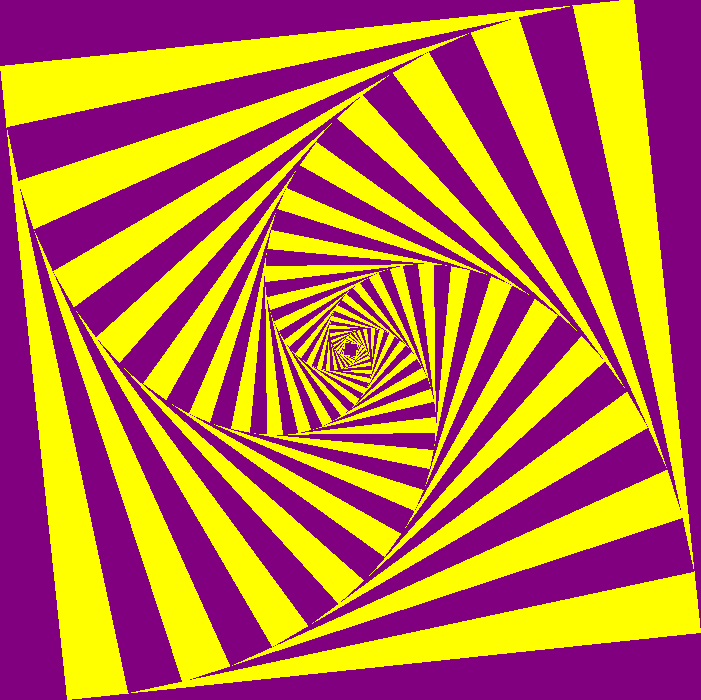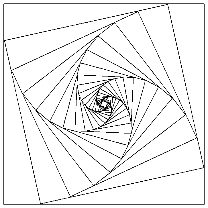 What is you were to use Python and Turtle Graphics? The same approach can be used. It is imperative that you use the shrinking rather than growing if you want filled squares as in turtle we are using a 2D tkinter window. Here are the same equations used in turtle graphics and python. The first one is 20 iterations, rotated 12.5 degrees and shrinking with pow(1/1.2,i). The second is 44 squares, rotation 6.05 degrees and scaling 1/1.1. The final one is with a smaller rotation, slower shrink rate and less rotation (70,1/1.05,3.125) and finally the same equation but iterating 20 times instead..