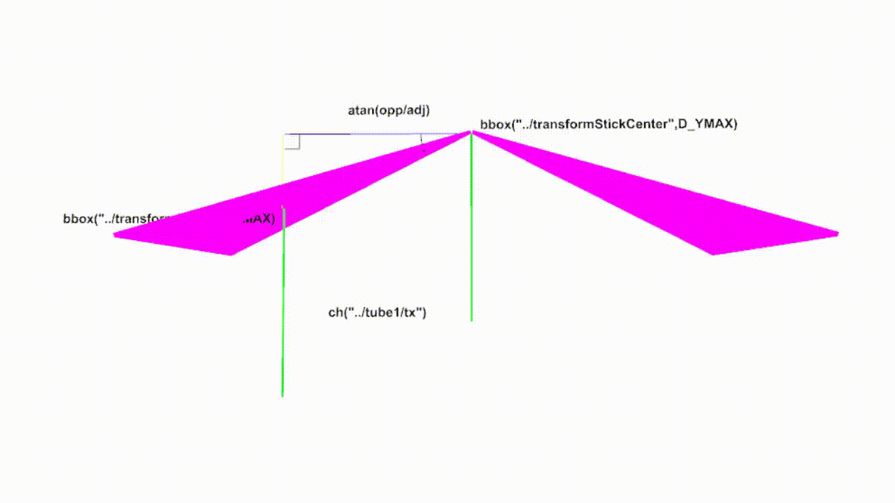 Starting with a simple example, we can push the wing up with the tube. Let's suppose first the pivot point of the wing is at zero. Using the bbox of the tube and grabbing the D_YMAX value (the maximum value of Y from zero) we have the y value and the distance from the wing to the tube is our x value. If we draw the triangle relationship we can see we have the information we need to calculate the angle.