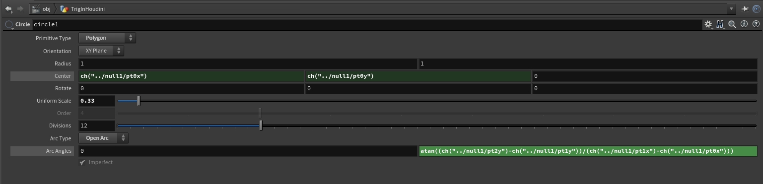 So in action in Houdini, atan gives the correct angle. You can use this as long as you know the locations of the points, or really the lengths of the opposite and adjacent sides. We could do this using the hypotenuse as well, but that would take more calculation based on Pythagorean theorem. We will review that later (or if you want to review now, see my video on what I call the 2-point constraint problem).