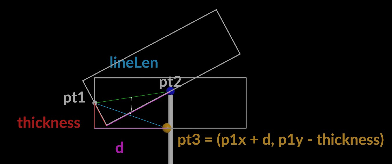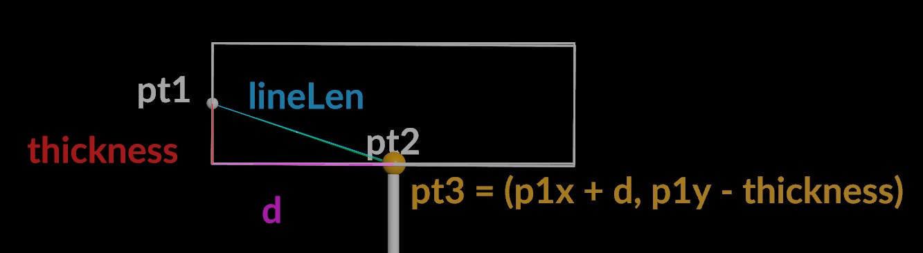 Note that @d is calculated by taking the sqrt of lineLen squared - thickness squared thanks to Pythagorean's theorem.