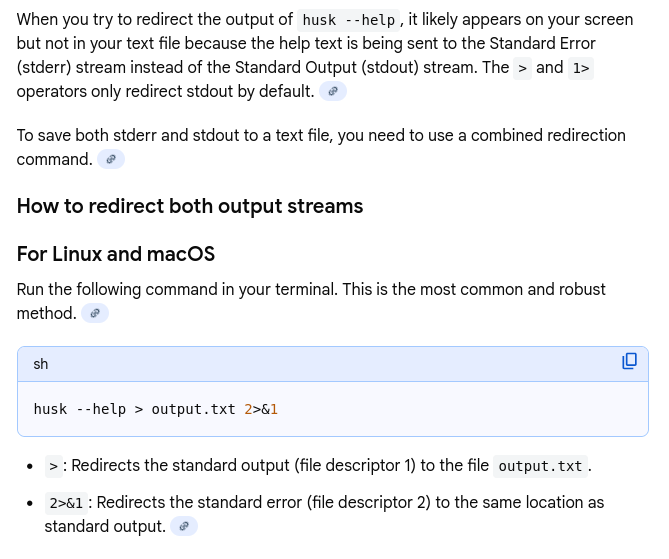 But the file will be empty. Why? Because --help writes to Standard Error (stderr), not Standard Output (stdout). Fix it with: