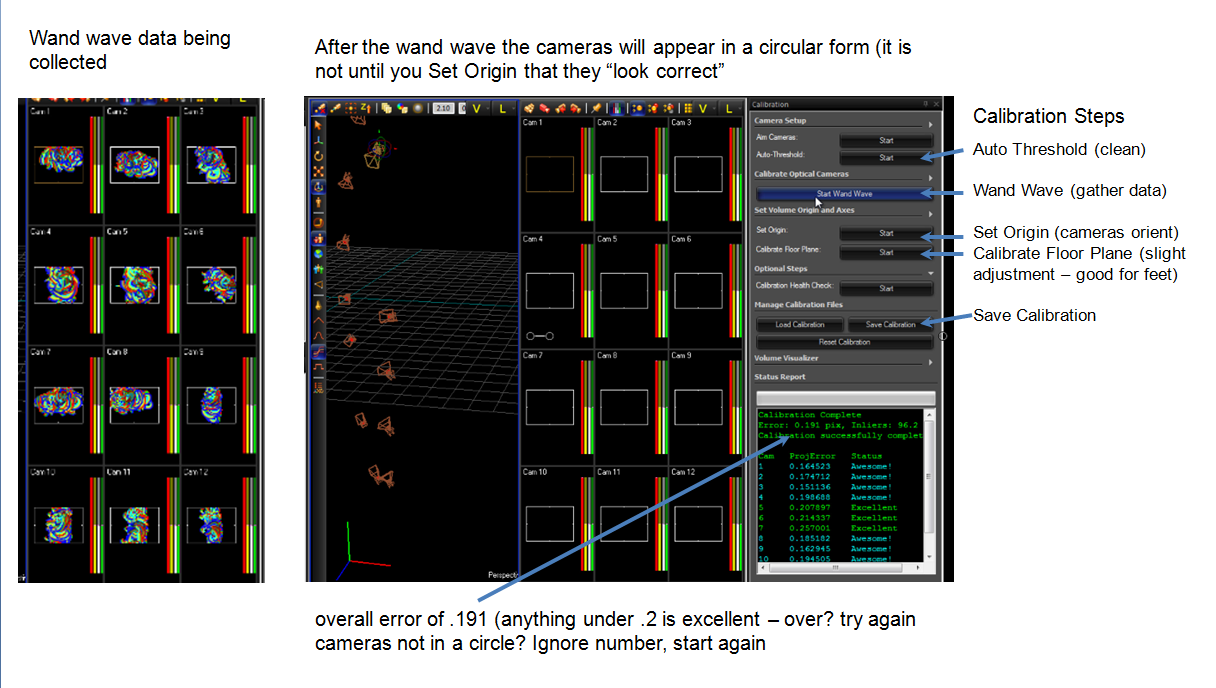 Walk around the perimeter of the capture volume waving the wand up and down and in circular motions. The cameras should reach a value of > 3000 to 5000 in the status report window. The green lights on the cameras will light solid green to indicate sufficient data (as well as the font color of the number in the lower right window). The values of projError are low - this is good. Expect an error with the new wand below .2.