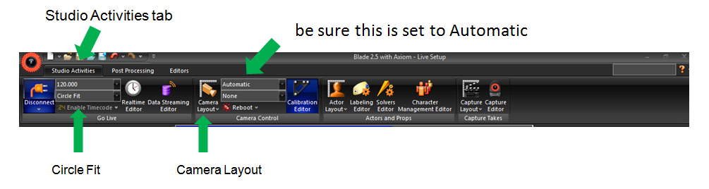 the workspace. Make sure the menu below Connect is set to CIRCLE FIT (this will only be set to CIRCLE FIT for calibration and RECONSTRUCT or SOLVE for capture). The process of calibrating the cameras involves the following: