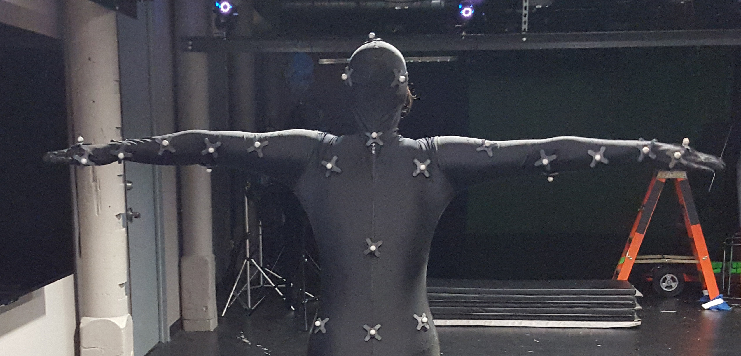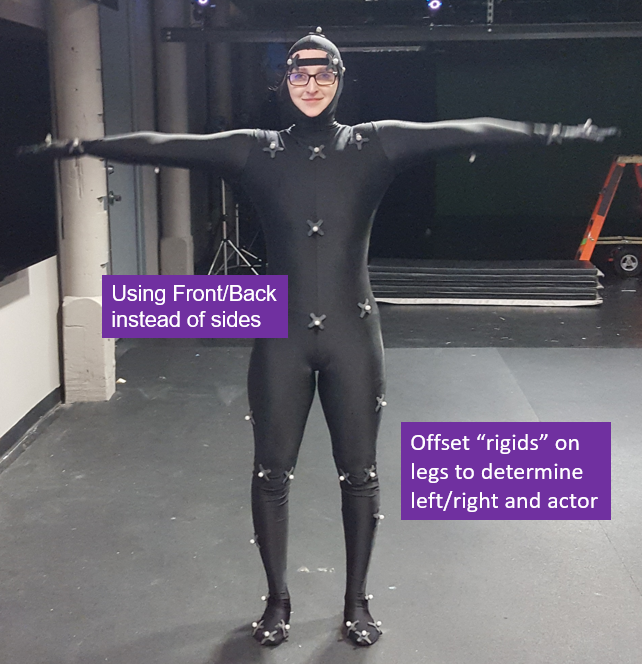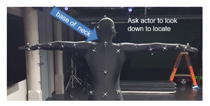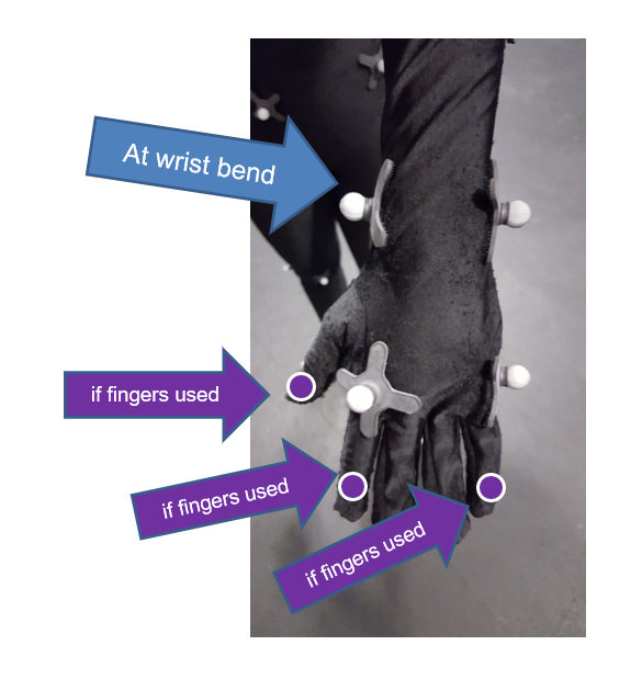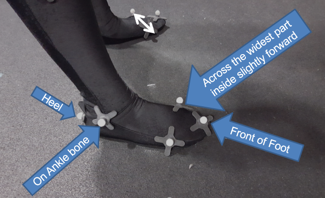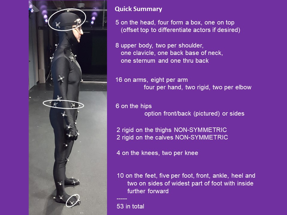 TIP: on the broad part of the foot - ensure the inside marker is further forward than the outside marker) TIP: on the hands, make the top two flat and the two on the sides of the wrist. TIP: the shoulder marker should not move when moving your arm about 45 degrees up from sides The thigh and mid-calf markers are slightly offset to allow the software to distinguish right/left TIP: Wiggle the velcro markers a bit on the suit to help them stick (particularly the hands/feet/knees), ask actor to try and shake them off Why this way? The skeleton in the software is defined in this way so that it understands this configuration. It corresponds to this set up when labeling the markers and creating the skeleton. Note - in Shogun an mcp file is created and saved automatically ... read on |